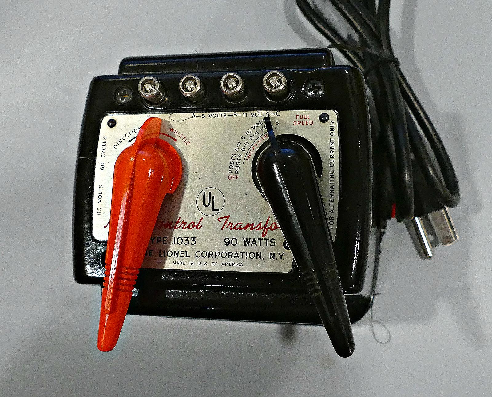 This sale is for an original Lionel 1033 model which is the 90 watt version. Another one of TinMan’s gotta make it more better department. Just added, we are now installing a bright Green LED on the front. This provides 2 functions. It is of course a power on indicator, and also is wired into the circuit breaker. In case of a derailment the light will go off letting you know the new circuit breaker has opened. First the circuit breaker has been replaced with an upgraded with a much faster unit with a manual reset button. Why? If and when you have an issue with your layout, this new breaker will open much faster plus it will stay open until you reset it by pushing in the red button on the side of the transformer. Also the power cord has been changed with a 3 wire grounded plug. Inside the transformer we have attached the ground wire to the metal bottom plate. This is done just in case there was an internal failure that could potentially send power to the metal bottom plate. This worse possible situation, would send any stray power to the ground pin. It also makes phasing multiple transformers a breeze.