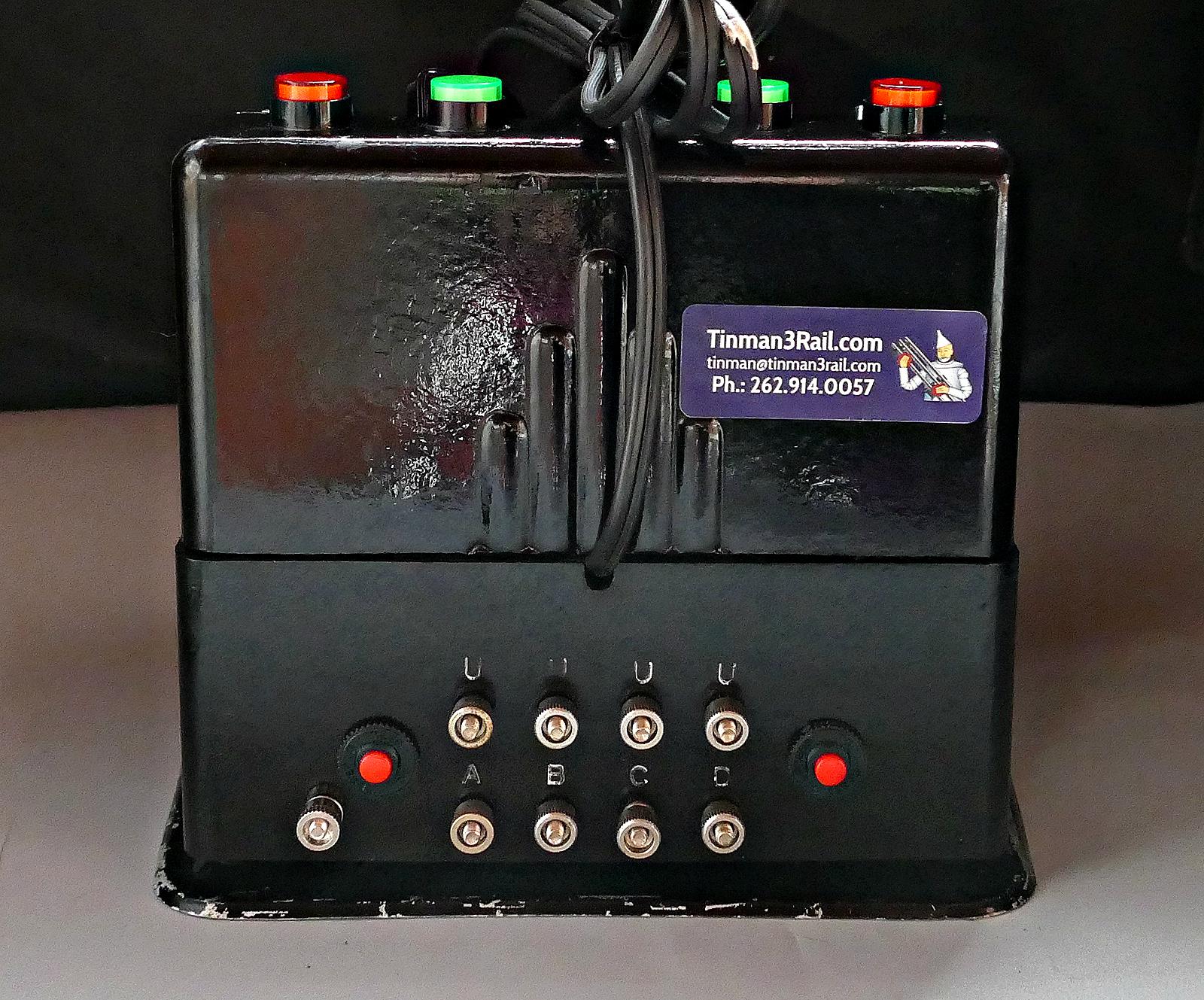 This is a very powerful transformer, much more so than the ZW’s and has been converted to have the same whistle / direction controls that we install in our KW and ZW transformers. They work on the c and d controls. Two manual circuit breakers are mounted on the back, one for the c and one for the D control. These are the same as we use in our circuit breaker kit which means you can use this transformer with modern solid state rolling stock. Those horrible light bulbs and sockets have been replaced with never burn out LED’s. Because there is no electrical connection anywhere on the outside of the case, a 2 prong plug works fine. There is an additional power output on the back for accessories.